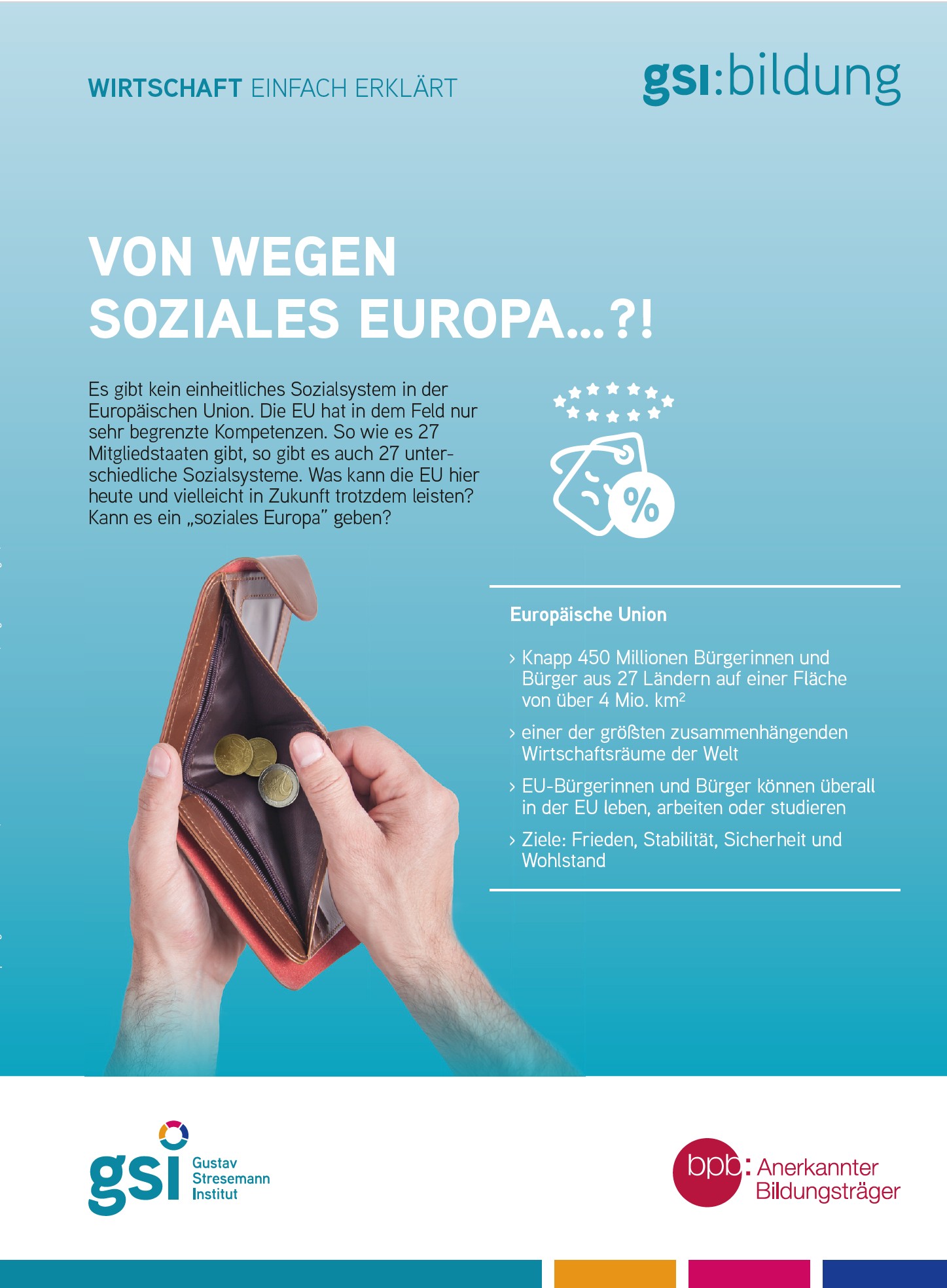 Was tut die EU eigentlich für mich? Europa steht vor sozialen Herausforderungen, die uns alle betreffen. Mit unserem Bildungsangebot möchten wir das Wissen über die soziale Dimension Europas schärfen, Diskussionen anregen und Ihnen praxisorientierte Materialien an die Hand geben, um dieses Thema in Bildungseinrichtungen zu behandeln.