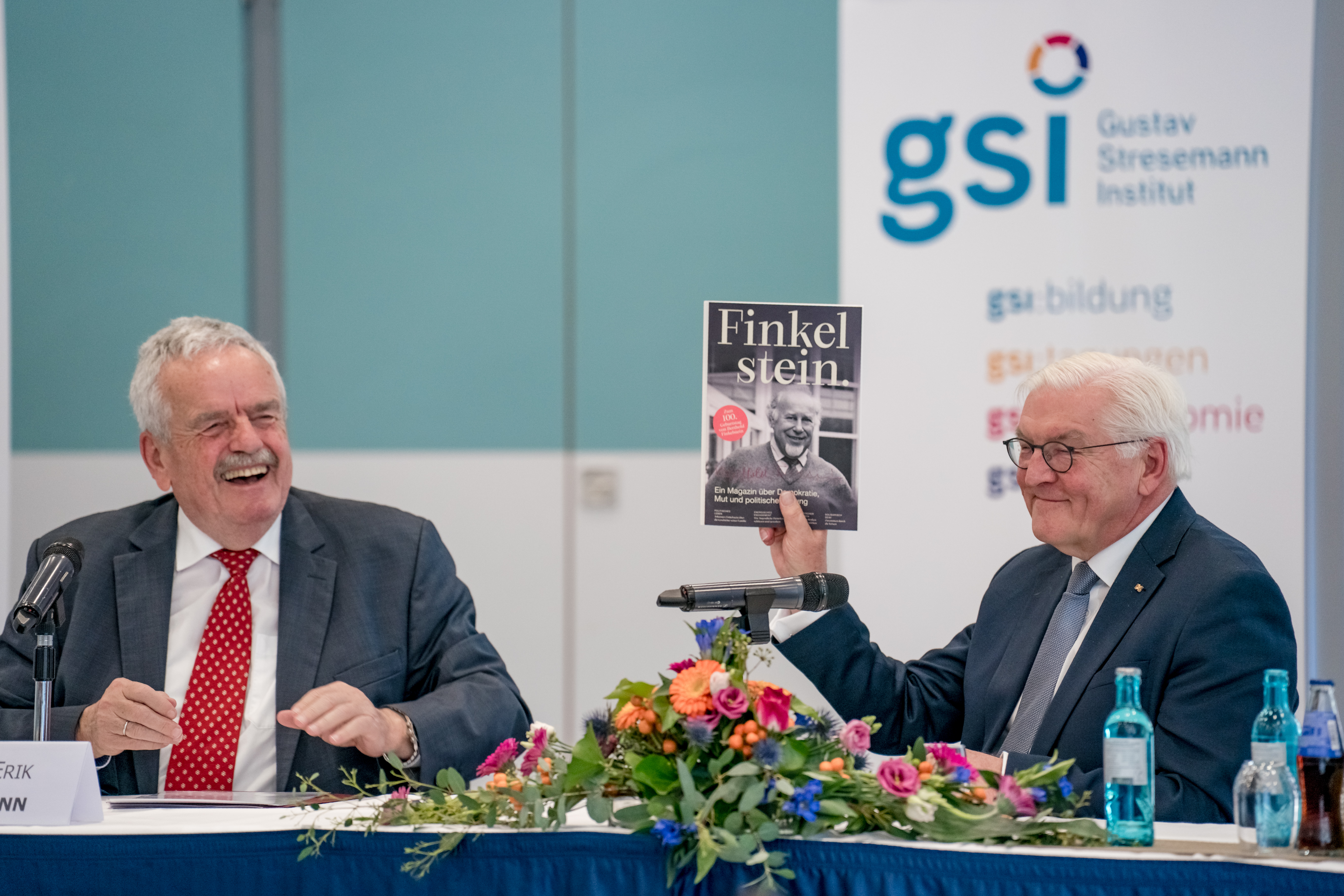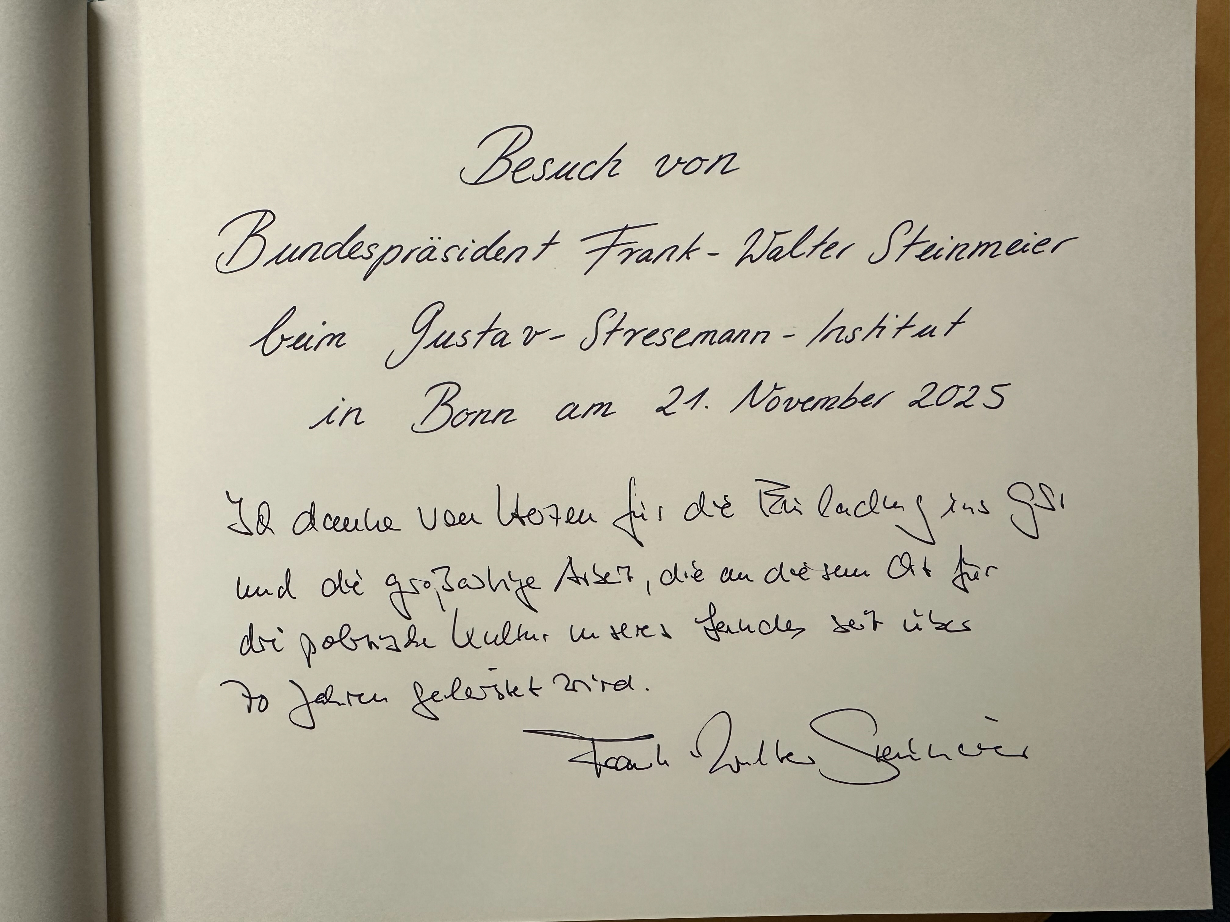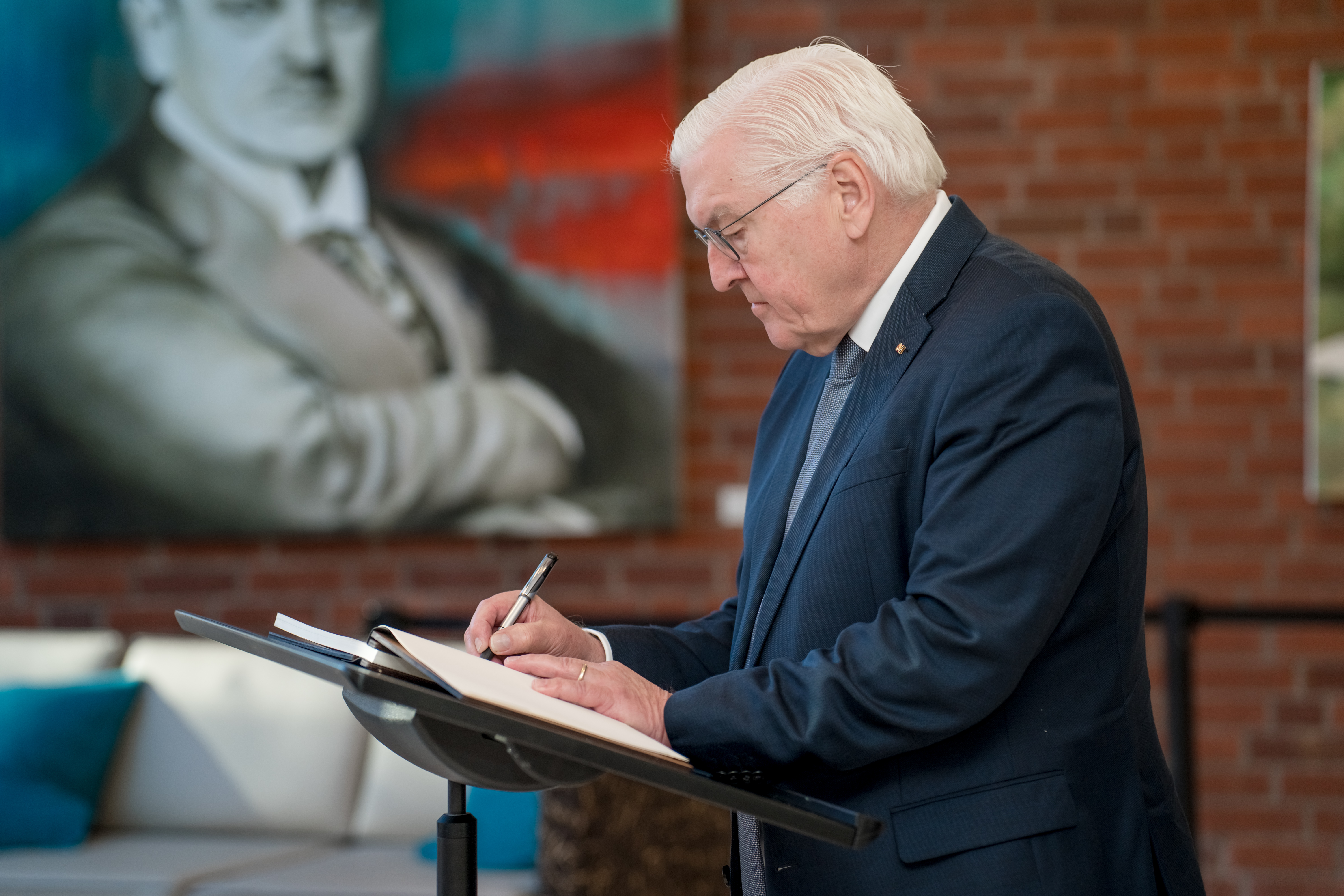 Nach dem Empfang durch Dr. h. c. Erik Bettermann, langjähriger GSI-Präsident und ehemaliger Intendant der Deutschen Welle, dem geschäftsführendem Vorstand und Leiter des GSI Wilfried Klein, Dr. Christina Stresemann, Vorsitzende des Stiftungsrates der GSI Gustav-Stresemann-Stiftung, und von Johannes Finkelstein, GSI-Mitglied und Sohn des GSI-Gründers Berthold Finkelstein, trug sich der Bundepräsident ins Gästebuch des Hauses ein.