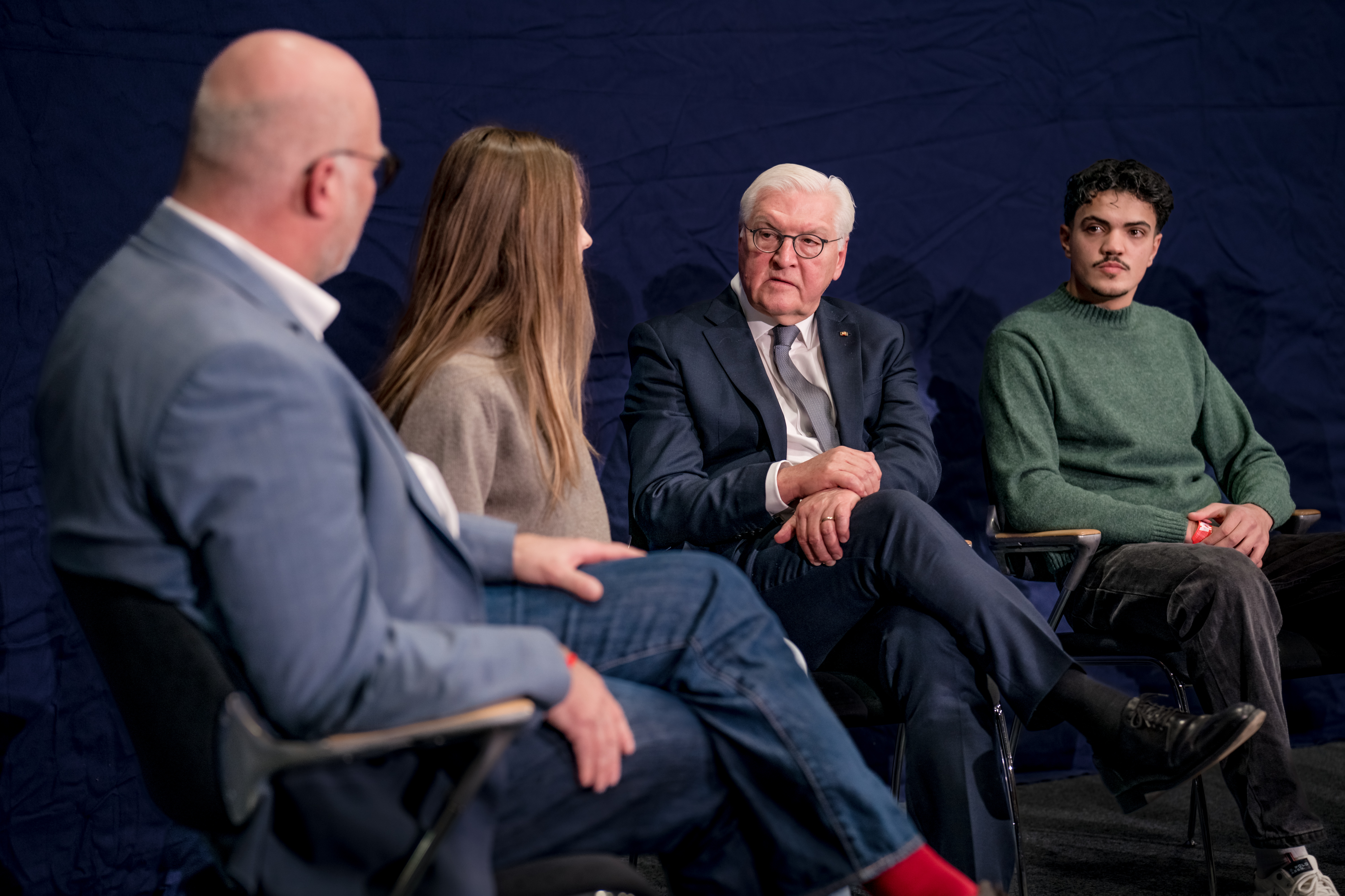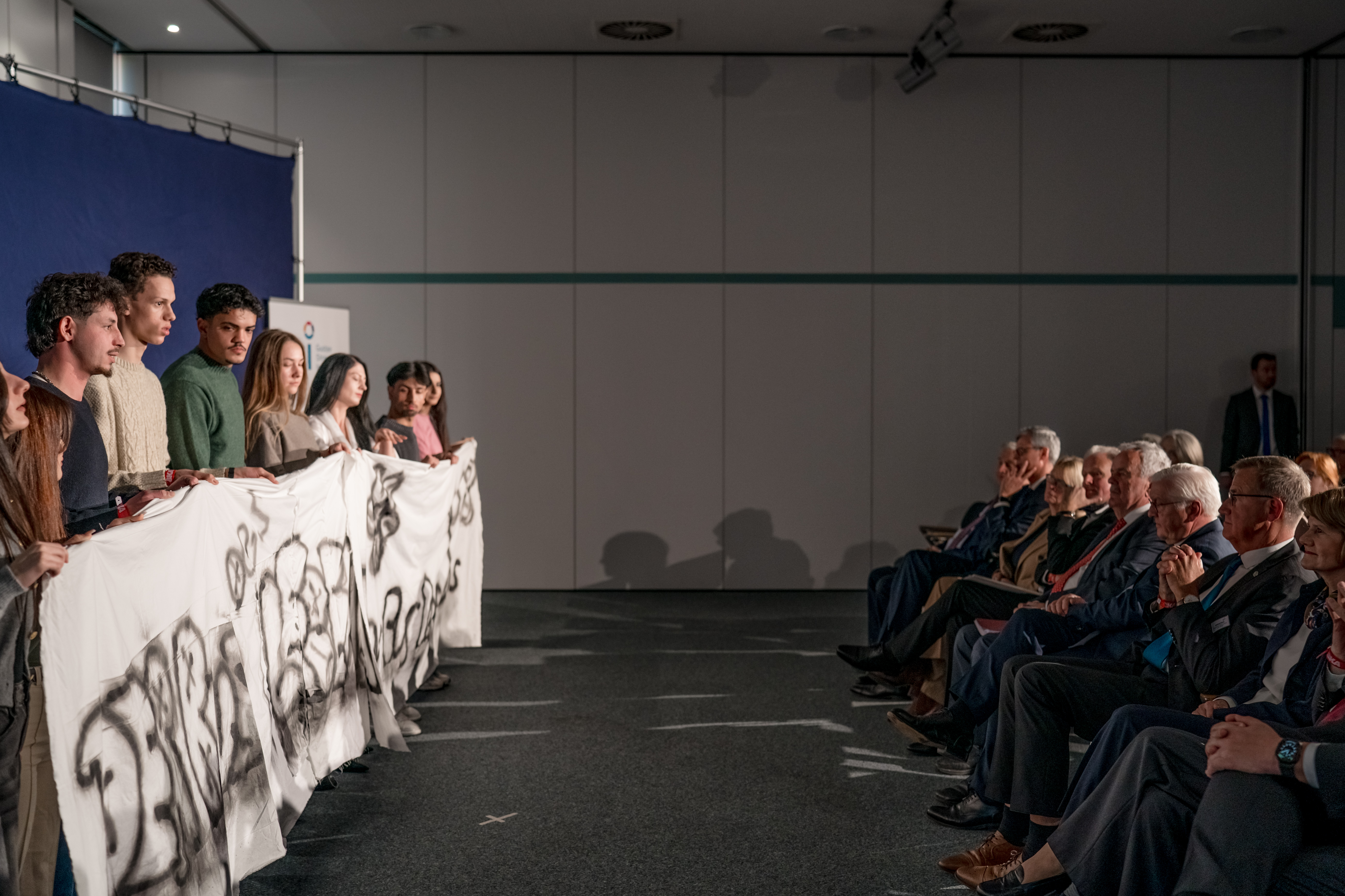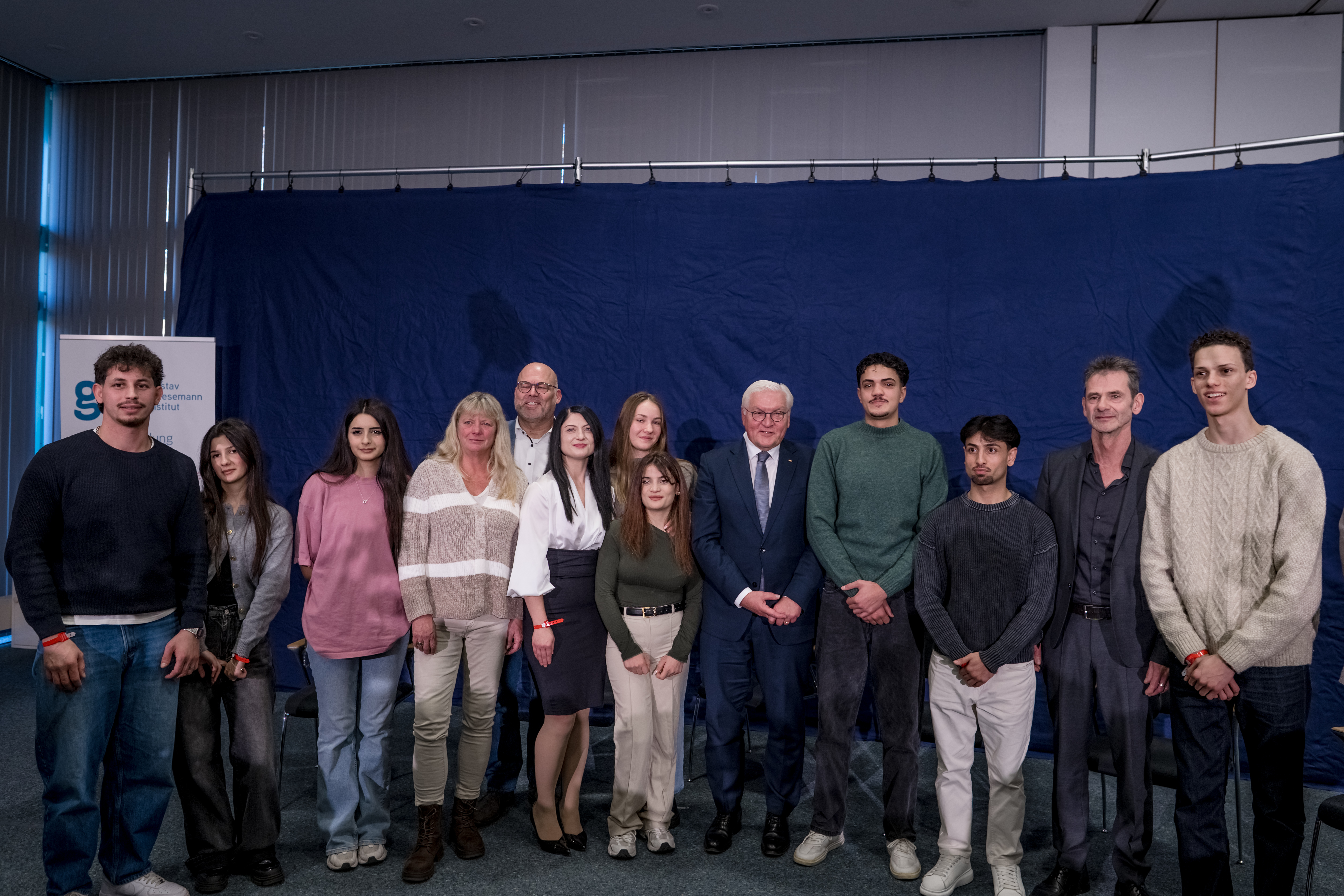 Anschließend gab es einen regen Austausch mit den GSI-Mitgliedern zu den Themen Demokratie und politische Bildung. Im Anschluss an den Austausch mit den GSI-Mitgliedern zeigten Schüler*innen der Bonner Abendrealschule einzelne Szenen des GSI-Theaterprojektes „Bus des Lebens“, in dem sie ihre Erfahrungen als Flüchtlinge verarbeitet haben. Schüler*innen und Projektverantwortliche berichteten im Gespräch mit dem Bundespräsidenten, wie kulturelle Methoden erfolgreich bei der Integration helfen können.